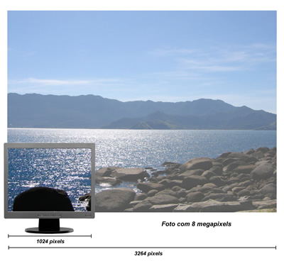 Para se ter uma noção, uma foto de 8 megapixels tem aproximadamente 3 mega bytes e chega a um tamanho de 3264 pixels de largura, mais de 3 vezes o tamanho da largura visualizada em um monitor na resolução mais comum, como pode ser visto na ilustração a seguir.